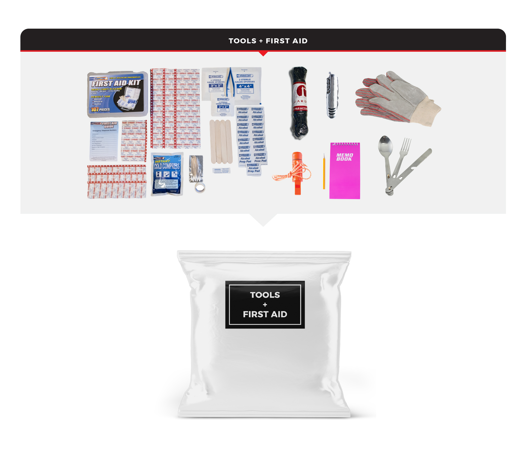 Tools and First Aid: These tools can be useful when you need help with navigation, transport, personal protection, or shelter. A first aid kit can be used to treat minor injuries and protect against more serious health threats in a disaster.